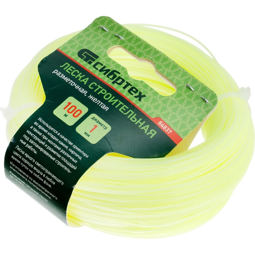 Леска строительная Сибртех 84837, длина 100 м, диаметр 1 мм, желтого цвета, пригодится на строительной площадке как ориентир при укладке материалов, установке конструкций. Также она будет полезна для садоводов для разметки территории. Если леску натянуть, то получается идеально ровная линия, что повышает точность работы, а также позволяет проводить замеры с ее помощью.