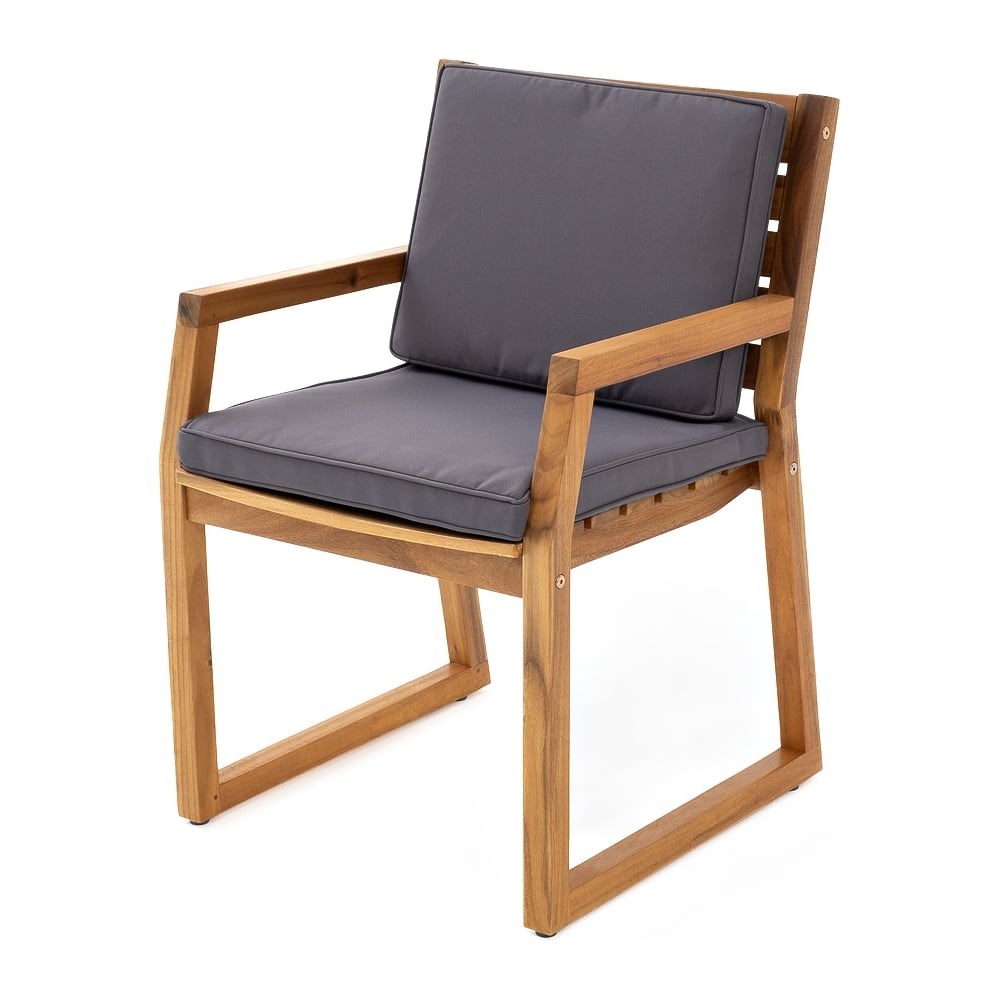 Садовая мебель из акации в современном стиле, дизайнерские формы мебели из этой коллекции создадут стильный и узнаваемый облик зоны отдыха на вашей веранде. Массив акации, отделка экомаслом под натуральный тик. Древесина, из которой изготовлена мебель, имеет сертификацию FSC (Forest Stewardship Council) -гарантия качества и происхождения древесины. Анодированная фурнитура из нержавеющей стали. Подушки в комплекте, ткань подушек – Olefin, цвет подушек темно-серый. Подушка для спины 48х50х4,5 1шт Подушка для сидения 47х36х4,5 1шт