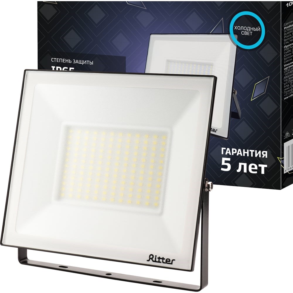 Светодиодный прожектор RITTER серия PROFI 230В 100 Вт 6500К 10000Лм IP65 черный 53410 9 предназначен для общего и акцентного освещения больших открытых территорий, домов, зданий, сооружений и промышленных объектов. Прожекторы серии PROFI не теряют своей эффективности при снижении напряжения в сети до 180 В, а использование новейших светодиодных технологий позволяет получить мощный светодиодный поток при низком потреблении электроэнергии. Прочный алюминиевый корпус и закаленное стекло защищают прожектор от неблагоприятных погодных условий и при этом обладают высокими теплопроводными характеристиками.