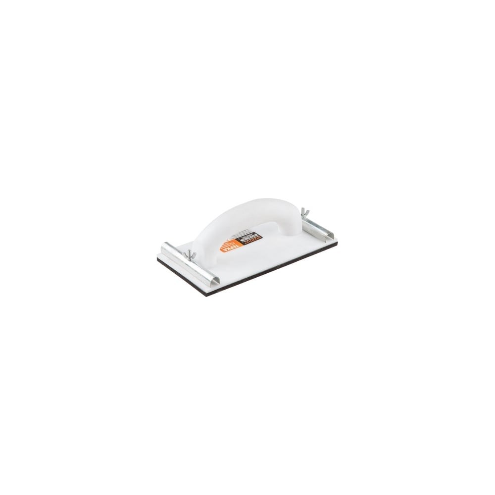 Терка для шлифования с металлическим фиксатором применяется для выравнивания штукатурных смесей при отделочных работах на поверхность стен или потолка. Посредством плавных движений, придаваемых терке, декоративная смесь частично втирается в стену, разравнивается на поверхности и доводится до финишного состояния. Представляет собой подошву, отлитую из пластика, с рукоятью и фиксаторами, предназначенными для крепления шлифшкурки.