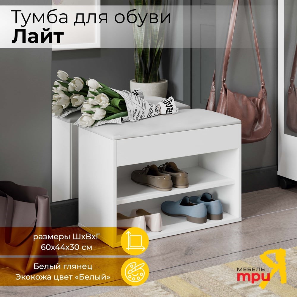 Тумба для обуви "Лайт" решит вопрос хранения обуви в прихожей. Вы сможете приспособить тумбу под любой стиль интерьера, а кроме внешних параметров и функциональности новинка отличается компактными габаритами и привлекательным внешним видом. Декор. Тумба выполнена полностью в белом цвете, такой декор способен освежить и преобразить комнату, а также привнести легкость в интерьер небольших прихожих. Функциональность. Тумба для обуви имеет открытую нишу для бережного хранения обуви и место под откидной крышкой. Данное пространство можно использовать для хранения обувных аксессуаров и различных мелочей, что без сомнений является преимуществом новинки.