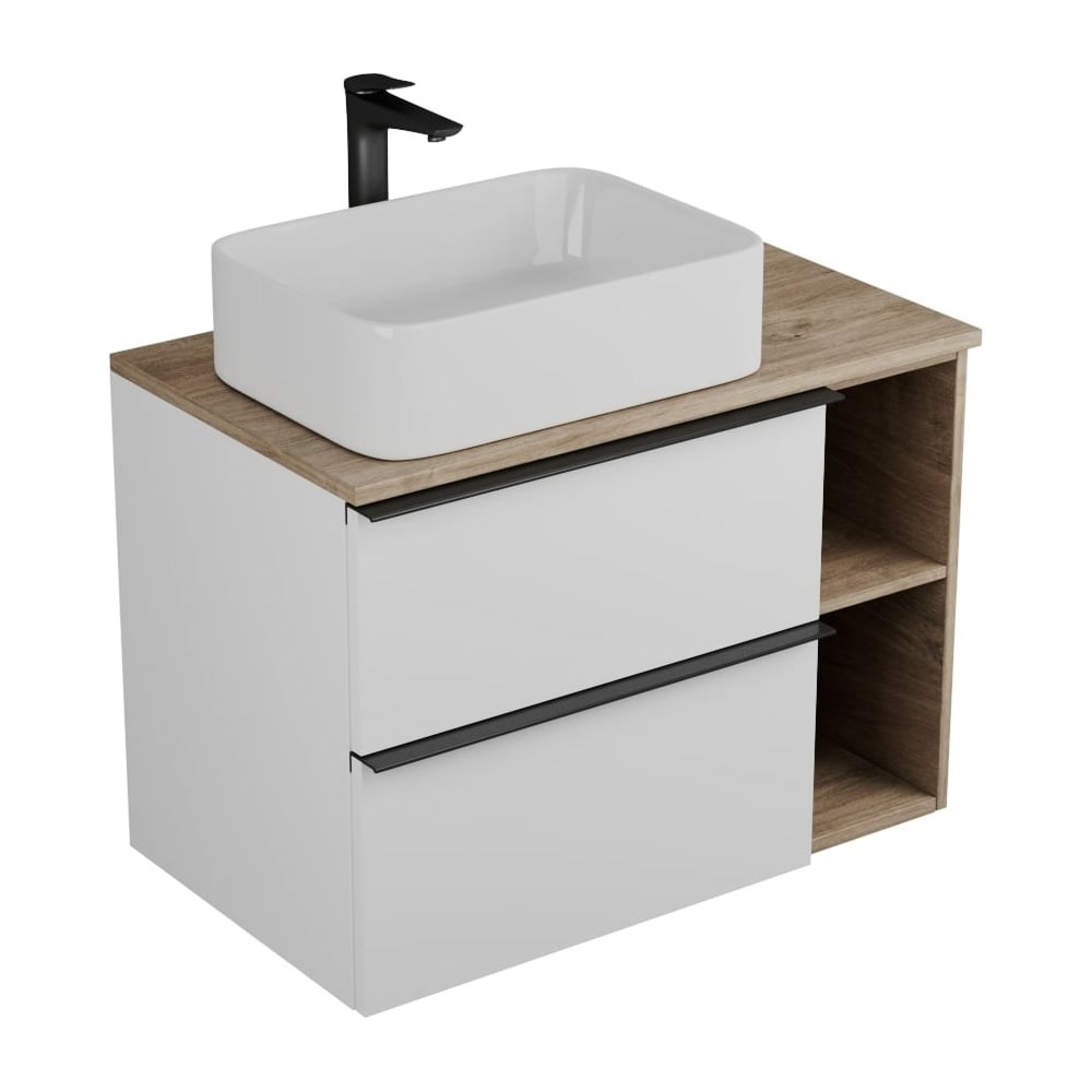 Тумба Sangro 80см (58022); корпус ВЛДСП-покрытие ПВХ; фасад МДФ 19мм-покрытие ПВХ; цвет белый матовый; столешница МДФ 19мм-покртиые ПВХ; цвет дуб харбо; верхний ящик с системой разделения; 2 выдвижных ящика со встроенным доводчиком плавного закрывания, скрытого монтажа; две ниши; внутренняя отделка цвет дуб харбо; раковина в комплект не входит; отдельно можно приобрести накладную раковину