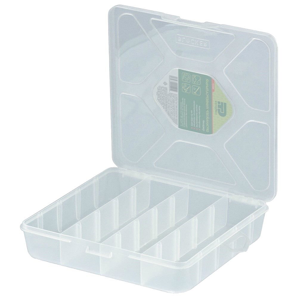 Универсальный средний органайзер Сибртех 90727 размером 200 х 200 х 45 мм, прозрачный матовый, используется для практичного хранения мелких предметов. Он подходит для распределения снастей, крепежа, хозяйственных мелочей и других предметов. Органайзер позволяет компактно расположить вещи в скрытых уголках квартиры: в шкафу, под кроватью и т.д.