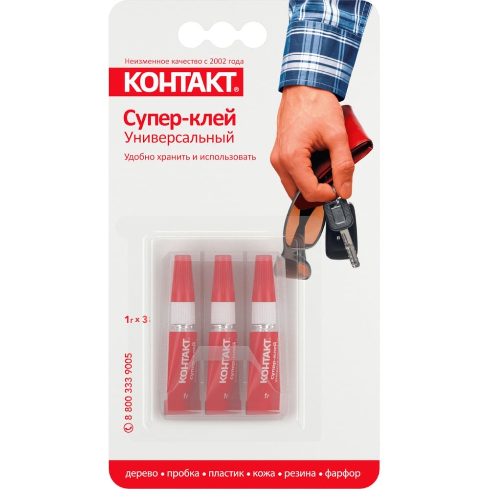 Супер-клей универсальный "КОНТАКТ" в контейнере – универсален для дерева, металла, кожи, резины, керамики и большинства пластиков. Идеальное решение для бытового и профессионального применения, где требуется мгновенная адгезия, термостойкость и долговечность.СКЛЕИВАЕТ В ЛЮБОМ СОЧЕТАНИИ • дерево • пробка • пластик • кожа • резина • фарфор • керамика • металлОднокомпонентный моментальный клей на основе этилцианакрилата обеспечивает сверхпрочное соединение материалов за 5-20 секунд с полной фиксацией через 10-15 минут.Для срочного ремонтаУдобно хранитьКонтейнер защищает тюбики от поврежденияНе предназначен для работы с полиэтиленом, полипропиленом, тефлоном. Не рекомендуется использовать для склеивания поверхностей, контактирующих с пищей.100% РЕЗУЛЬТАТ Между склеиваемыми поверхностями не должно быть зазора. Чем больше площадь склеиваемых поверхностей, тем выше прочность склеивания.