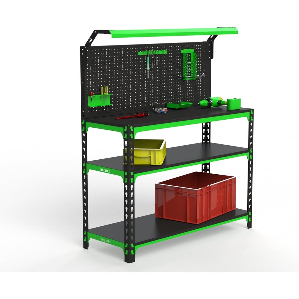 Верстак подойдет для небольшой мастерской или производственного помещения. Модель оснащена комплектом освещения, который обеспечивает комфортную работу пользователя. Используется в качестве дополнительного оборудования для верстаков. Перфопанель с комплектом аксессуаров является дополнительный элементом для верстака, который увеличивает рабочее пространство и структурирует хранение инструмента. Перфопанель изготовлена из стали толщиной 0.8 мм. Крепление панели: болтовое. Стол-верстак выполнен из стали толщиной 1,5 мм. Предназначен для удобной организации отдельного рабочего места на производствах, складах, гаражах, мастерских, и на других объектах. Максимум распределённой нагрузки на весь верстак составляет - до 500 кг. Максимум распределённой нагрузки на полку составляет - до 200 кг. Крепление стола: безболтовое. Цвет: тёмно-серый+зелёный.