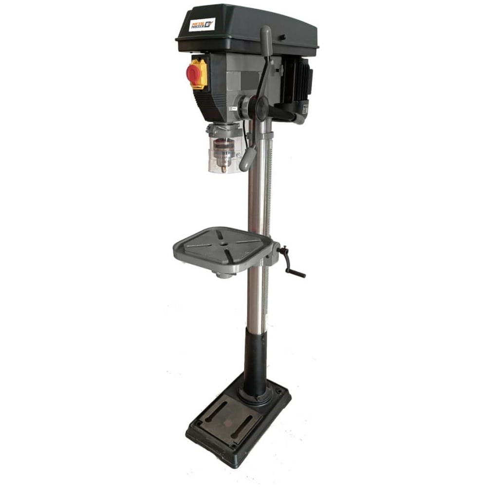 Вертикально-сверлильный станок MetalMaster M25D 20044 предназначен для сверления сквозных и глухих отверстий в черных и цветных металлах диаметром до 25 мм. На лицевой стороне сверлильной головы расположены кнопки включения и выключения станка с крышкой, которая также используется как аварийный выключатель. Станок оснащен быстрозажимным патроном с регулируемым защитным экраном, что обеспечивает безопасность для оператора. С правой стороны фрезерной головы расположена трех-лучевая рукоятка опускания пиноли с нониусом. Станок имеет возможность перемещения сверлильного стола по оси Z при помощи зубчатой рейки и вращения рукоятки. Скорость вращения шпинделя регулируется с помощью перекидывания ремней в блоке ременных шкивов. Схема расположения ремней с диапазоном оборотов расположена под защитной крышкой кожуха. Станок оснащен мощным и надежным асинхронным двигателем с медной обмоткой мощностью 900 Вт. Сверлильный стол имеет возможность поворота на 45° в обе стороны по вертикали для обработки отверстий под углом. Стол оснащен пазами для крепления заготовок и оснастки. Контроль угла поворота сверлильного стола осуществляется по шкале угломера. Модель дополнительно оснащен возможностью вращения стола на 360⁰ по горизонтали. Станок оснащен лазерным указателем для корректной установки заготовки на рабочем столе что позволит с точностью просверлить отверстие там, где это необходимо. Станок установлен на мощное чугунное основание, на котором так же есть пазы для крепления заготовок и оснастки. Основание крепится к полу с помощью анкерных болтов.