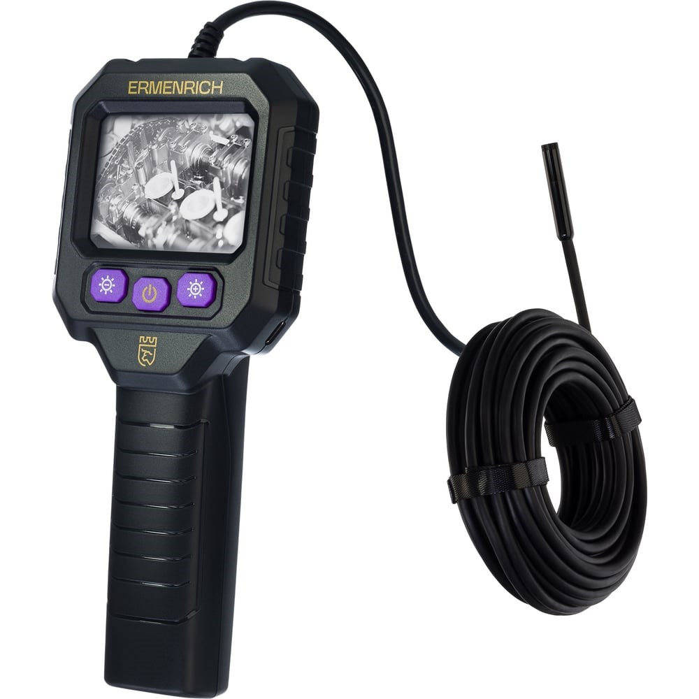 Видеоэндоскоп Ermenrich Seek VE20 – удобный способ осматривать труднодоступные, затемненные места во время ремонта и обслуживания зданий, трубопроводов, промышленного оборудования, бытовой техники и транспорта. Подходит как для бытового, так и для профессионального использования. Конструкция состоит из самого прибора с экраном и удобной рукояткой, гибкого кабеля длиной 10 метров и камеры. Диаметр камеры – 8 мм, угол обзора - 70° по горизонтали. Светодиодная подсветка позволяет работать в полной темноте. А влагозащищенность уровня IP67 предохраняет камеру от попадания пыли и воздействия влаги. Изображение передается на цветной экран TFT. Диагональ экрана 2,8", разрешение 1280x720 пикс обеспечивает детальную и четкую картинку. Источник питания прибора – литий-ионный аккумулятор емкостью 2600 мАч. Заряда аккумулятора достаточно для 5 часов непрерывной работы. Для зарядки используется кабель USB Type-C.