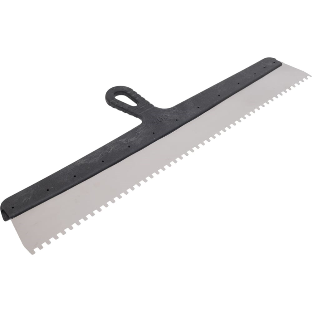 Зубчатый шпатель предназначен для равномерного нанесения клеевого состава при укладке плитки, мозаики и т.д. Квадратные зубья облегчают нанесение клеевого состава, позволяя ровно и экономно распределять его по поверхности. Зубья размером 6х6 мм рассчитаны на плитку площадью 100-400 см2. При изгибающих нагрузках шпатель быстро восстанавливает свою форму. Рабочее полотно выполнено из нержавеющей стали, что обеспечивает коррозионную стойкость. Инструмент имеет эргономичную рельефную ручку. Рукоятка выполнена с небольшим наклоном для комфортного нанесения и выравнивания растворов. В рукоятке предусмотрено отверстие для подвешивания шпателя.