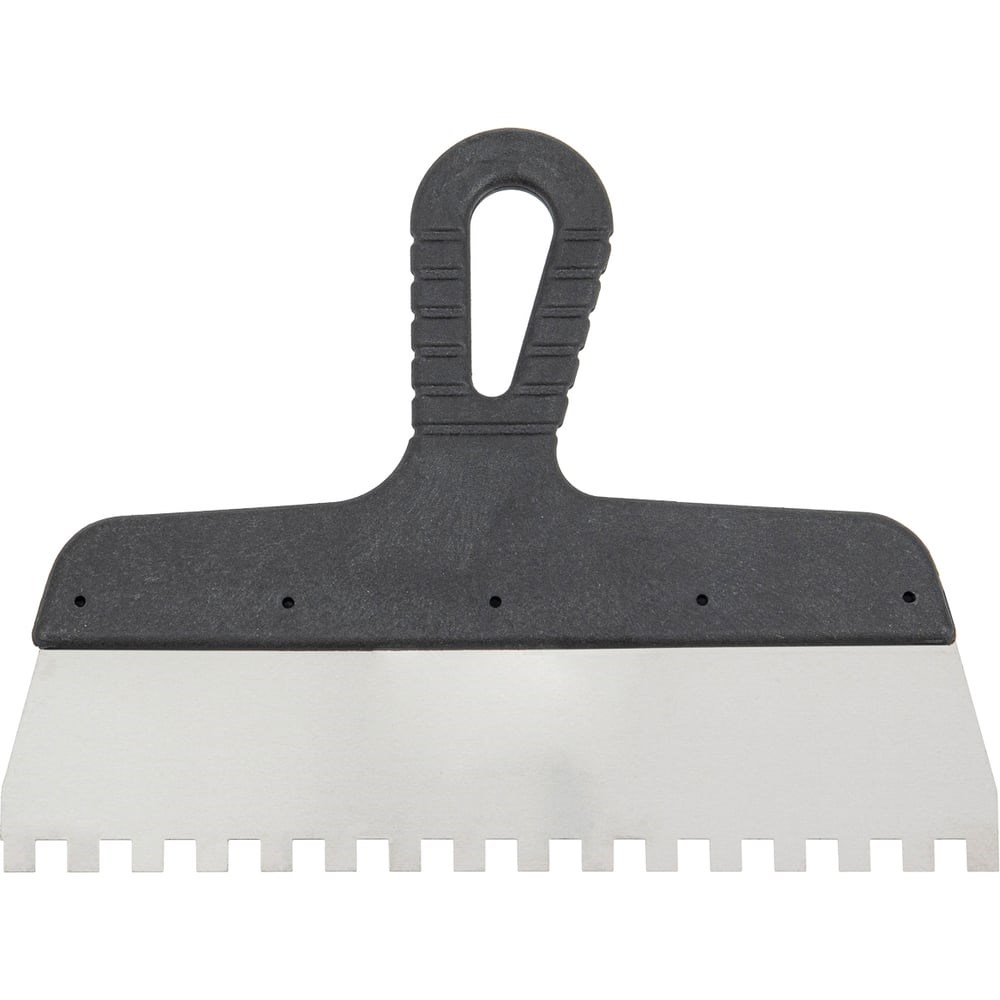 Зубчатый шпатель предназначен для равномерного нанесения клеевого состава при укладке плитки, мозаики и т.д. Квадратные зубья облегчают нанесение клеевого состава, позволяя ровно и экономно распределять его по поверхности. Зубья размером 8х8 мм рассчитаны на плитку площадью 400-900 см2. При изгибающих нагрузках шпатель быстро восстанавливает свою форму. Рабочее полотно выполнено из нержавеющей стали, что обеспечивает коррозионную стойкость. Инструмент имеет эргономичную рельефную ручку. Рукоятка выполнена с небольшим наклоном для комфортного нанесения и выравнивания растворов. В рукоятке предусмотрено отверстие для подвешивания шпателя.