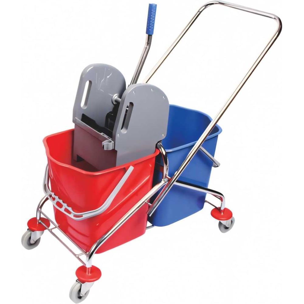 Тележка уборочная с двумя ведрами предназначена для уборки и мойки полов, перемещения воды, моющих растворов и клининговых принадлежностей. Тележка для уборки оснащена удобными съемными ведрами вместимостью по 25 литров, которое имеет металлическую ручку и носик для удобного слива воды. Каркас тележки выполнен из прочной стали, обеспечивая надежность и долговечность использования. Поворотные колесики из стали с пластиковыми протекторами и защитными бамперами обеспечивают плавное и бесшумное передвижение тележки по поверхности. На горизонтальную перекладину ручки можно поместить подвесную корзину для моющих составов, протирочных материалов и других принадлежностей. Два ведра уборочных позволяют не смешивать грязную и чистую воду, сливать грязную жидкость в одно ведро, и использовать чистый моющий состав для дальнейшей уборки.