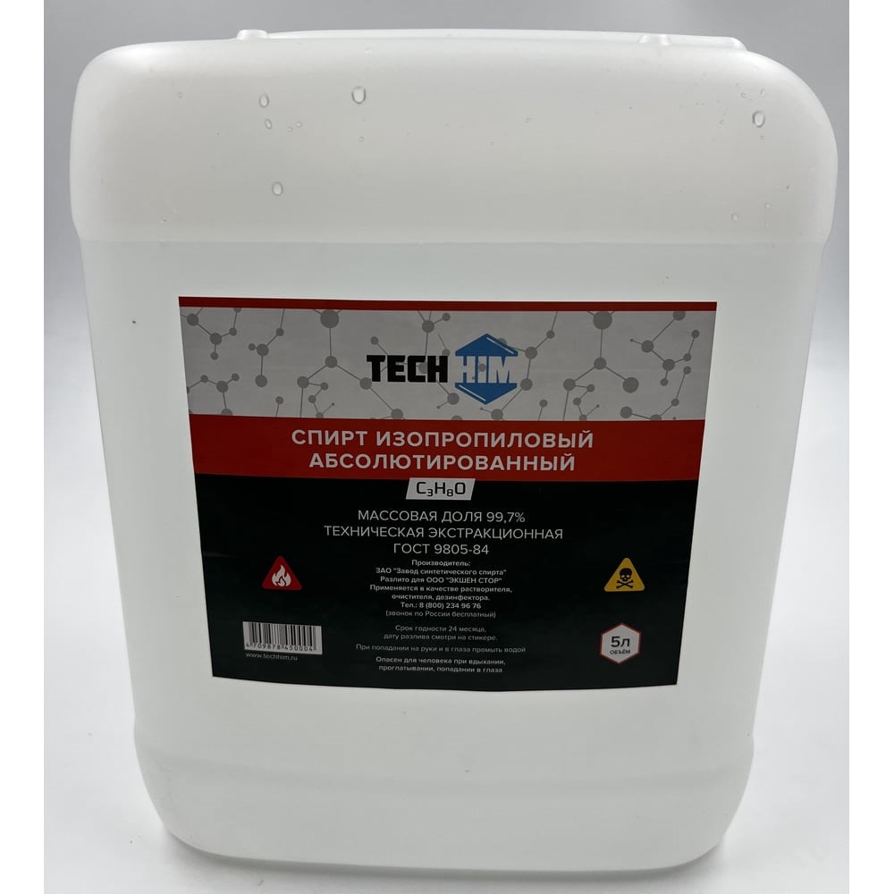 Изопропиловый спирт абсолютированный 99,7% ГОСТ 5 л от TECHHIM – это универсальное средство для дезинфекции и уборки, которое необходимо иметь в каждом доме и офисе. С помощью этого дезинфицирующего средства можно очистить и обработать множество поверхностей, инструментов и предметов, включая игрушки, корзины, скотч, коробки, пластик, полы и многое другое. Благодаря своей высокой концентрации – 99,7% Изопропанола, этот спирт является эффективным и быстрым дезинфицирующим раствором. Средство идеально подходит для дезинфекции рук, маникюрных инструментов, а также для ухода за кожей, благодаря своему кровоостанавливающему и царапинам предотвращающему действию. Кроме того, можно использовать для мытья собак и кондиционирования их шерсти. Этот дезинфицирующий спирт легко разбавляется с водой и может использоваться как моющее и дезенфицирующее средство в домашней химии. Емкость 5 л позволяет использовать его в любых условиях, как дома, так и на работе. Не требуется много времени и усилий для обработки и уборки, благодаря универсальному действию. Купите изопропиловый спирт абсолютированный 99,7% ГОСТ 5л и обеспечьте себе и своим близким чистоту и безопасность в каждом помещении!
