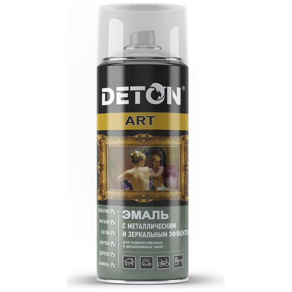 Эмаль с металлическим и зеркальным эффектом Deton ART Хром аэрозольная 520 мл DTN-A70689 предназначена для декоративного окрашивания картинных рам, украшений и различных деталей интерьера. Состав обладает хорошей адгезией к бетону, камню, пластмассе, древесине, черным и цветным металлам. Высохшее покрытие придает поверхности яркий металлический блеск.
