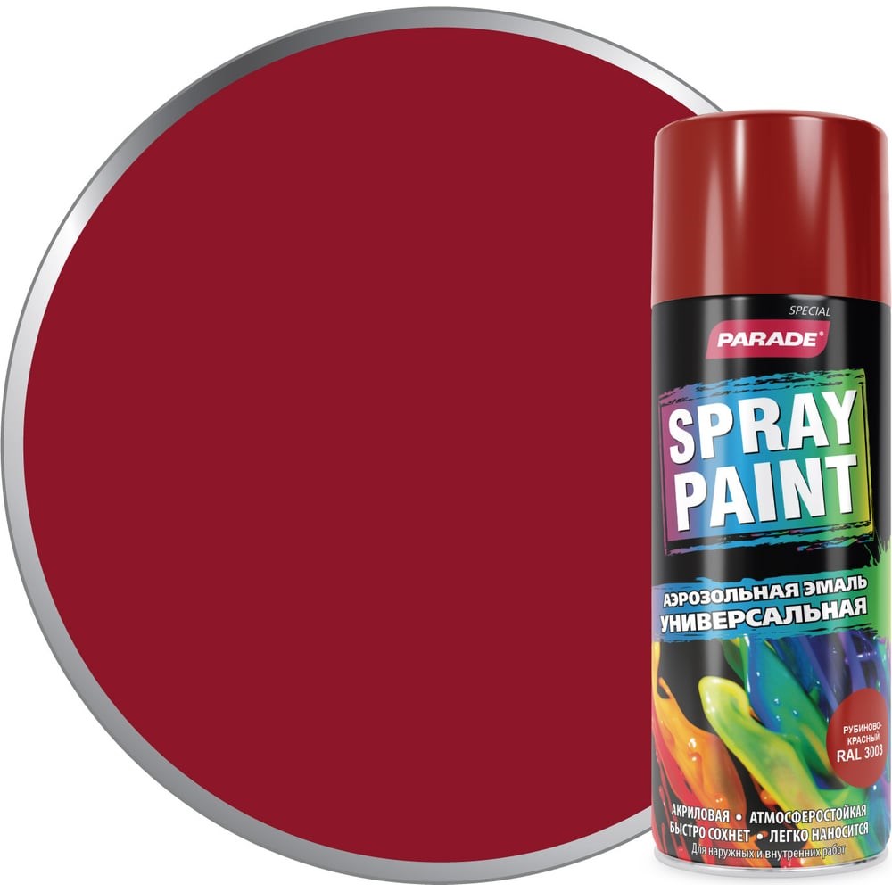 Аэрозольная эмаль PARADE SPRAY PAINT RAL 3003 Рубиново-красный Лк-00008443 образует прочное покрытие на деревянных, металлических или кирпичных поверхностях. Эмаль отличается высокой укрывистостью. Продукт устойчив к негативным атмосферным воздействиям. Удобно наносится с минимальными потерями, легко проникает в труднодоступные места.