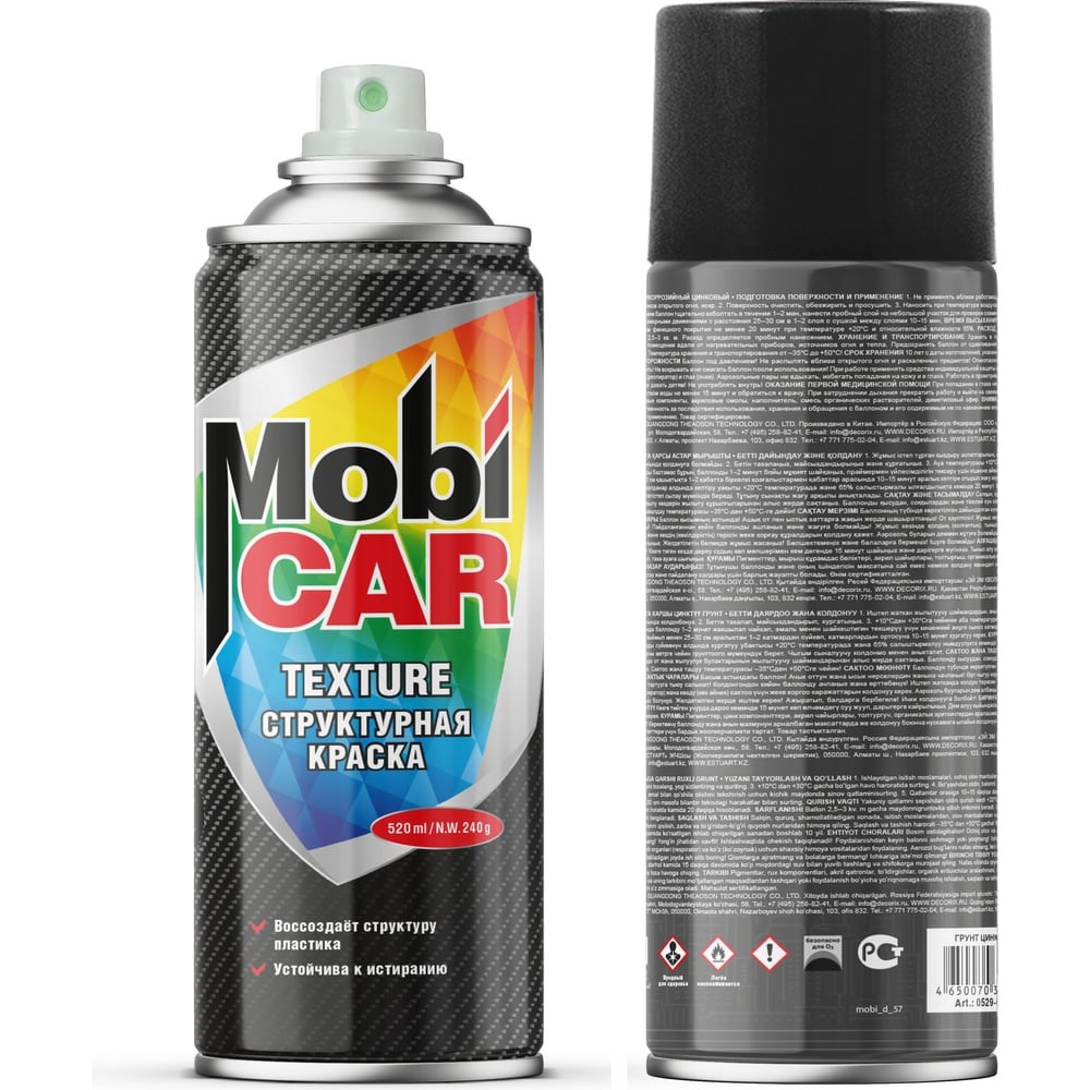Аэрозольная структурная краска Mobicar TEXTURE, 520 мл, чёрный текстурный 0526-01 MC предназначена для декоративно-оформительских работ и ремонтного окрашивания. Применяется для воссоздания структуры поврежденных пластиковых деталей, таких как бампер, молдинги, приборная панель, отделка дверей, зеркал и т. п. Идеально подходит для декорирования элементов отделки помещений и предметов, окрашивания техники и инструментов. Краска образует шероховатое покрытие имитирующее структуру пластика. Обладает повышенной устойчивостью к истиранию и царапинам, высокой адгезией к пластиковым поверхностям. Аэрозольная краска удобна для равномерного окрашивания небольших поверхностей и труднодоступных мест.