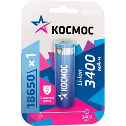 Аккумулятор Космос 18650 LI-ion 3400 mAh 1BL с защитой KOC18650Li-ion34PBL1 с защитной платой используется в фонарях или устройствах где отсутствует контроллер заряда/разряда. Встроенный контроллер возьмет на себя защиту от перезаряда, перегрева и полного разряда. При невысокой цене продукт имеет на 100% честную ёмкость, подтвержденную замерами. Максимальный ток заряда/разряда:3,4А. Размеры аккумулятора без упаковки: высота 71 мм длина 18.4 мм ширина 18.4 мм