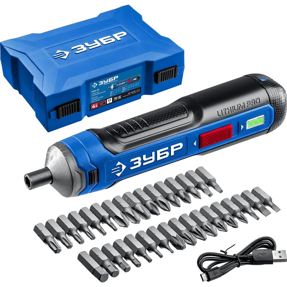 Аккумуляторная отвертка ЗУБР Профессионал 4 Vmax, в кейсе с набором 33 бит PSD-4S позволяет работать с любым крепежом благодаря высокому крутящему моменту с электронной регулировкой ограничения. Интуитивное управление включением или принудительный ручной режим делают эксплуатацию изделия простой и эффективной. Особенности Реверс Два способа включения - естественным нажатием и выключателем Быстрый тормоз вала без паразитного выбега Литий-ионный аккумулятор без эффекта памяти и саморазряда с увеличенной для отвертки емкостью Плавная регулировка крутящего момента благодаря электронной муфте с тонкой настройкой Начальный момент в 0.2 Нм позволяет без повреждения заворачивать самые тонкие шурупы в даже в мягкие материалы Micro-USB кабель обеспечивает возможность подключения к зарядному устройству мобильного телефона Планетарный двухступенчатый редуктор имеет больший КПД и надежнее обычных редукторов, а также обеспечивает высокий крутящий момент на выходе Яркая подсветка рабочего места способствует дополнительному удобству при работе в условиях недостаточного освещения Противоскользящее покрытие корпуса обеспечивает надежное удержание