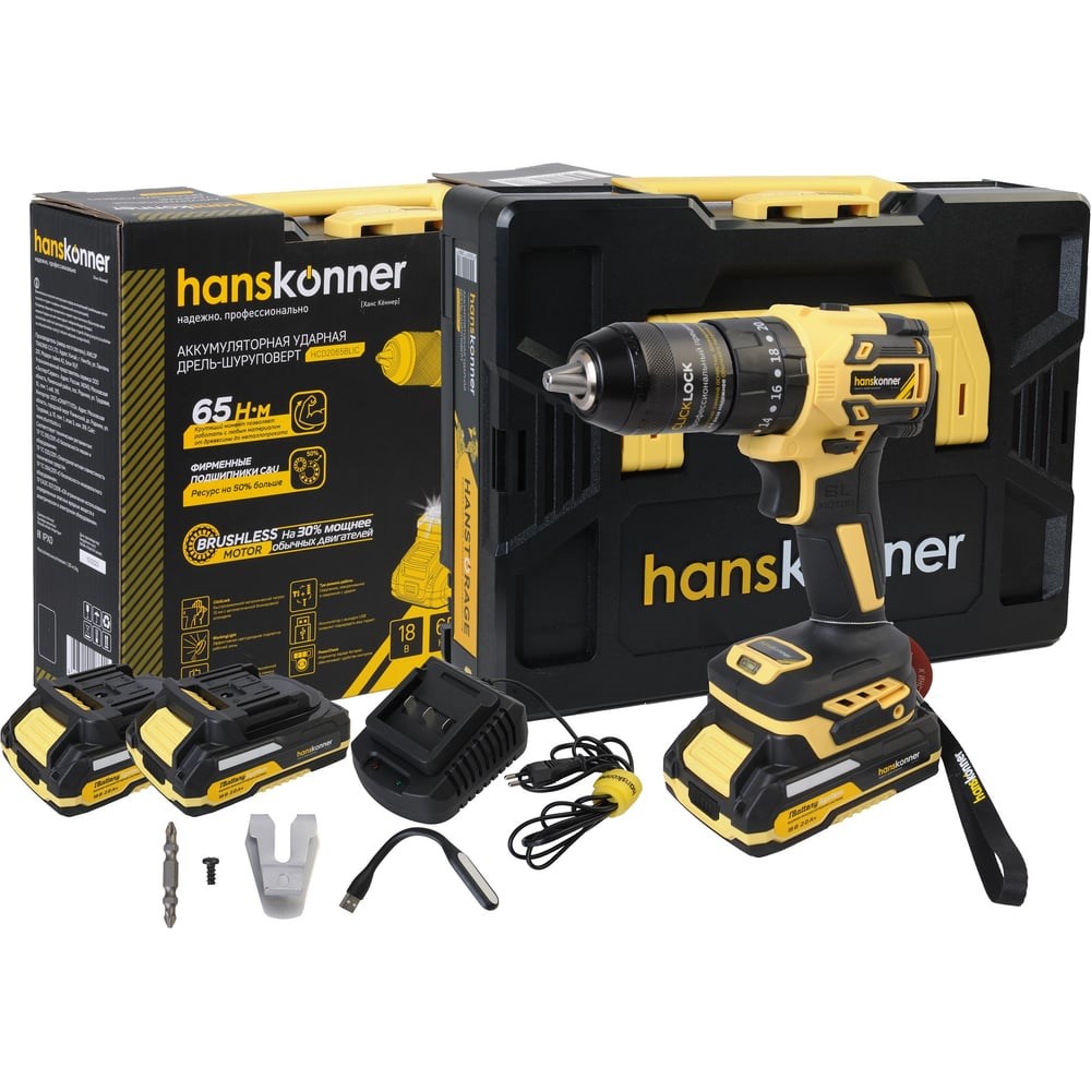 Аккумуляторная ударная дрель-шуруповерт Hanskonner HCD2065BLIC подходит для любых работ, в том числе в стесненных условиях и труднодоступных местах без снижения производительности и потери качества работ. Крутящий момент 65 Н•м позволяет работать с любым материалом от древесины до металлопроката. Компактный и легкий бесщеточный двигатель имеет наиболее выгодные параметры работы. Блокировка шпинделя и широкая муфта быстрозажимного патрона ClickLock позволяют менять оснастку одной рукой и закреплять её с наилучшей фиксацией. Усиленный цельнометаллический патрон с диаметром захвата 13мм расширяет набор применения оснастки для выполнения работ с повышенной нагрузкой. Максимальный диаметр сверления в дереве/стали/бетоне— 25/13/13мм. 20 ступеней крутящего момента, режим сверления и режим сверления с ударом позволяют устанавливать любой крепеж без его повреждения и вдавливания в материал. Фальш-кольцо защищает патрон от повреждений в узких, труднодоступных местах. Данная модель является частью системы 1BatterySystem и совместима со всей линейкой аккумуляторного инструмента. Два Li-Ion аккумулятора 2.0 Ач с собственной системой защиты от перегрузки, перегрева и глубокого разряда обеспечат полную непрерывность в работе. Функция быстрой зарядки зарядного устройства полностью восстановит работоспособность аккумулятора 2.0Ач всего за 50минут. Аккумулятор с выходом USB позволит подзарядить ваш гаджет.