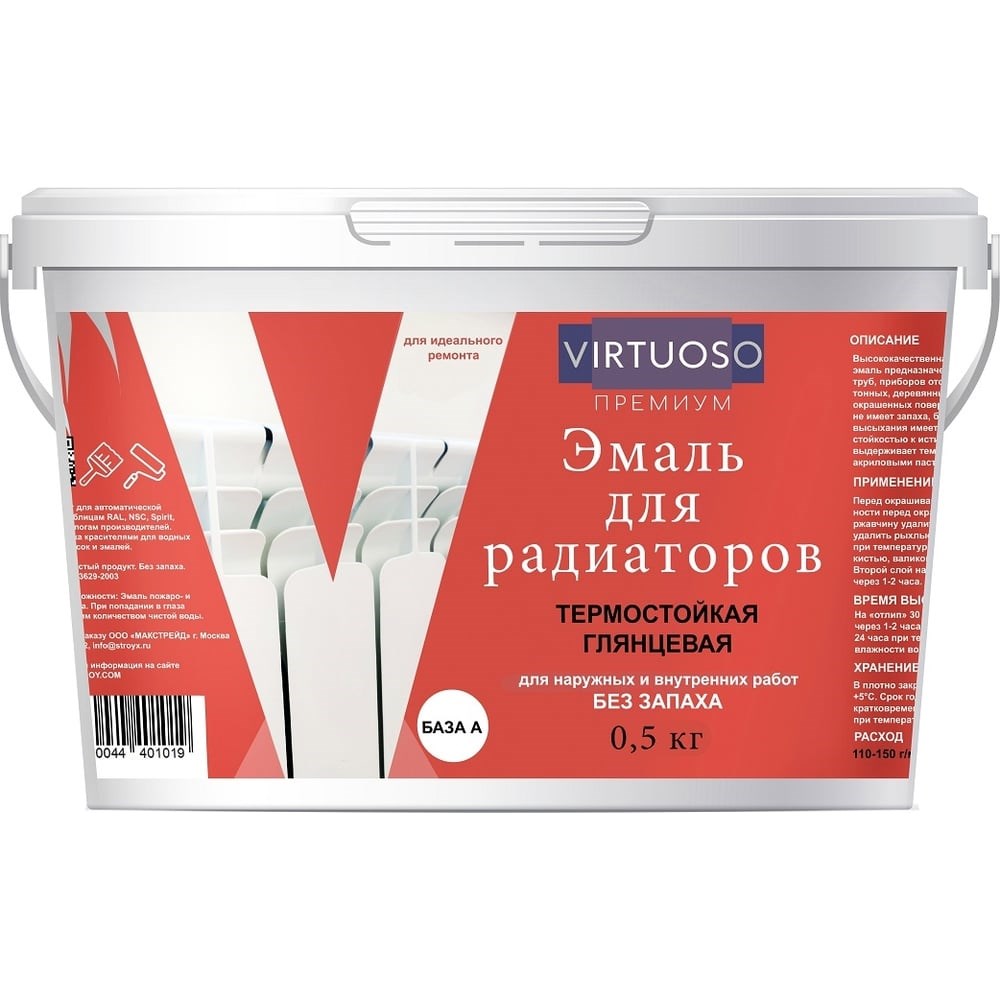 Акриловая эмаль для радиаторов VIRTUOSO PREMIUM белая, глянцевая 0,5кг 11593937 предназначена для защитно-декоративного окрашивания металлических труб и батарей внутри помещений. Выдерживает нагревание до +100°С, при этом не желтеет, сохраняет стойкий белый цвет.Выдерживает влажную уборку с применением моющих средств (не абразивных). Обладает высокой укрывистостью. Легко наносится и растирается без особых усилий, не оставляя подтеков. Колеруется колерными пастамиНе имеет резкого запаха и не токсична.Расход 100-130 г/м²