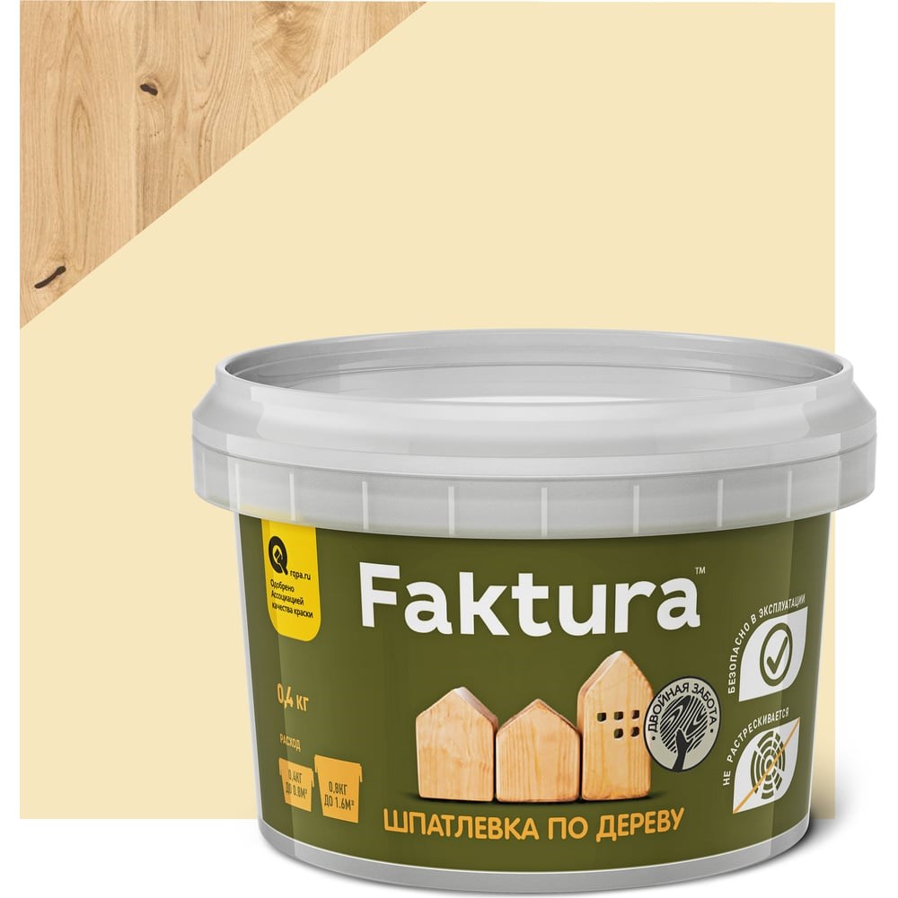Акриловая шпаклевка по дереву FAKTURA для наружных и внутренних работ, сосна, банка 0,4 кг О02558 предназначена для финишного выравнивания и устранения неровностей, углублений и сколов на деревянных поверхностях, эксплуатируемых в атмосферных условиях и внутри помещений, в т.ч. с повышенной влажностью для последующей окраски водо- и органоразбавляемыми материалами FAKTURA™: лаками, пропитками, эмалями. Тонированная под ценные породы дерева. Без запаха. С минимальной усадкой, не растрескивается.