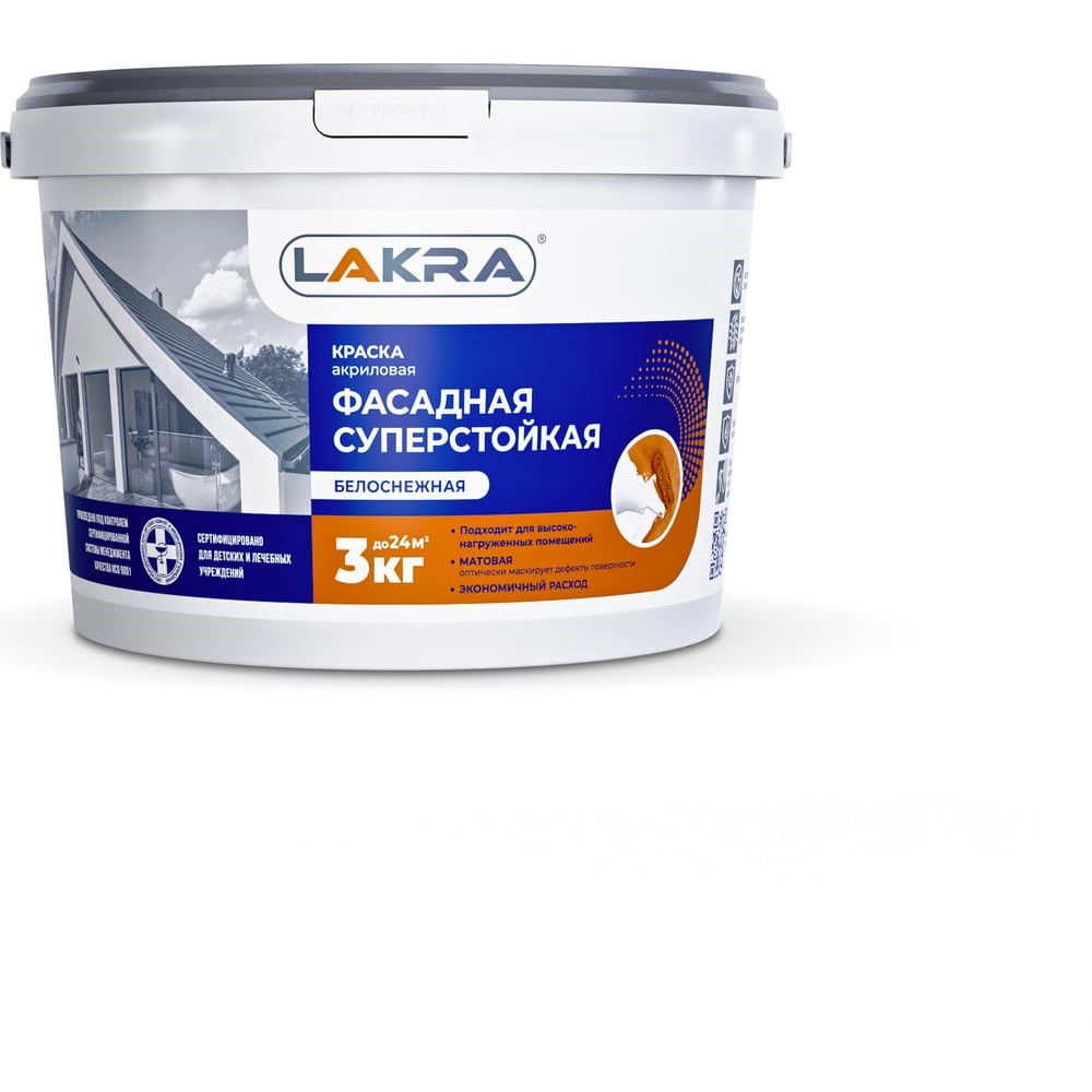 Фасадная краска ЛАКРА акриловая, суперстойкая, белоснежная, 3 кг 8306491 ЛА-00000061 - высококачественная краска на основе водной акриловой дисперсии. Применяется для окраски фасадов зданий, балконов, а также идеально подходит для внутренних работ в помещениях с интенсивной эксплуатационной нагрузкой (офисы, залы ресторанов, учебные и лечебные заведения, промышленные, административные помещения) и высокой влажностью (кухня, ванная, подвальные помещения). Благодаря составу, продукт имеет отличные адгезионные свойства к бетонным, кирпичным, оштукатуренным и другим минеральным поверхностям.