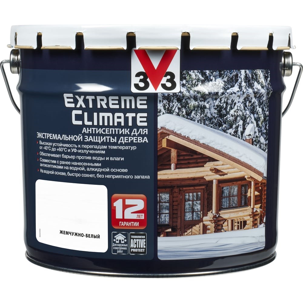 Акриловый антисептик для дерева V33 EXTREME CLIMATE матовый, жемчужно-белый 117452 используют во время ремонтных, строительных и отделочных работ внутри и снаружи помещений. Входящий в состав воск придает конструкции водоотталкивающие свойства. Продукт равномерно распределяется по поверхности и образует дышащую микропленку. Средство защищает древесину в экстремальных погодных условиях от ультрафиолета, грибка и насекомых. Антикоррозионные добавки предотвращают образование ржавчины на металле.