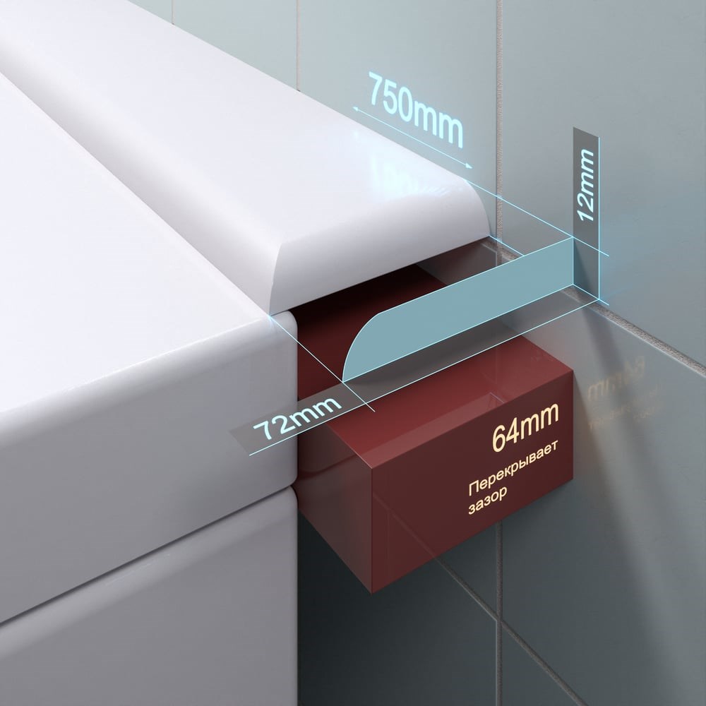 Лаконичное решение для перекрытия зазора между плиткой и ванной. Акриловый камень из которого сделан бордюр - это твердый, цельный материал. Прост в монтаже и уходе, не меняет свой цвет и форму. Не допускает появления грибка и плесени. Для распила потребуется ножовка по металлу или торцовочная пила с диском по дереву или алюминию, монтаж производится на герметик или водостойкий клей. Ширины бордюра - 72 мм хватит, для того чтобы перекрыть зазор до 64 мм. Благодаря своим оптимальным размерам, он не только защитит от попадания воды в щели и предотвратит распространение плесени, но и хорошо скроет все мелкие недостатки. Для облицовки ванной бордюрами с 3-х сторон понадобится: Прямой бордюр 180 см, Левый бордюр 75 см, Правый бордюр 75 см.