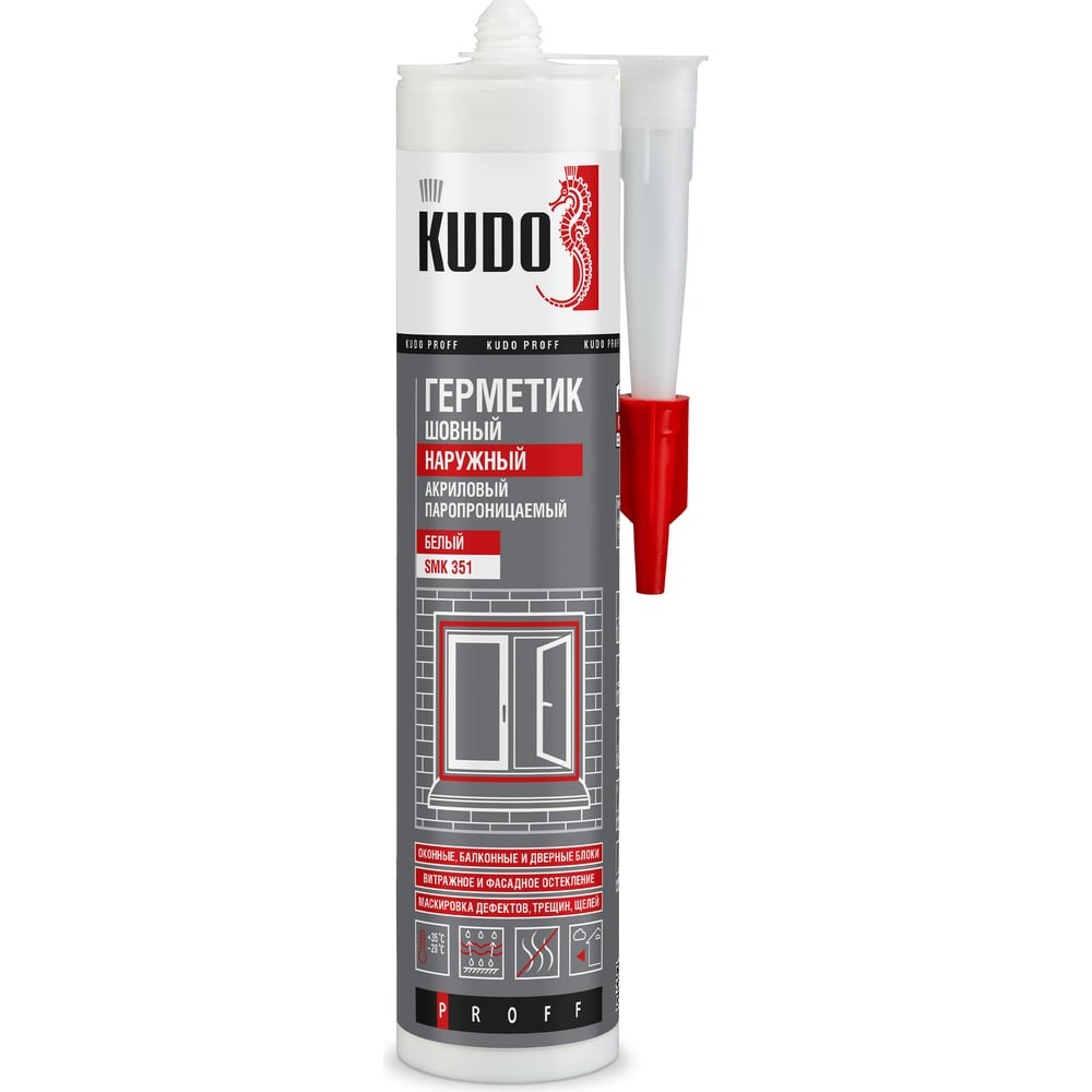 Акриловый паропроницаемый шовный герметик KUDO PROFF наружный, белый, 280 мл SMK-351 предназначен для устройства наружного слоя монтажного шва в местах примыкания оконных блоков (включая балконные), дверных блоков и входных групп, витражных конструкций к проемам стен отапливаемых зданий гражданского и промышленного строительства с допустимой деформацией монтажного шва не более 15%.Применяется для герметизации наружного слоя монтажного шва оконных, балконных и витражных конструкций, а также для работ по герметизации зазоров между стенами, потолками, плинтусами, подоконниками, деревянными и металлическими оконными рамами, бетоном и кирпичной кладкой. Акриловый шовный герметик для окон и дверей подходит для устранения и маскировки дефектов: швов, трещин, щелей, пустот в деревянных, кирпичных и бетонных стенах. Для наружных работ.Внимание! Не подходит для непрерывного погружения в воду.