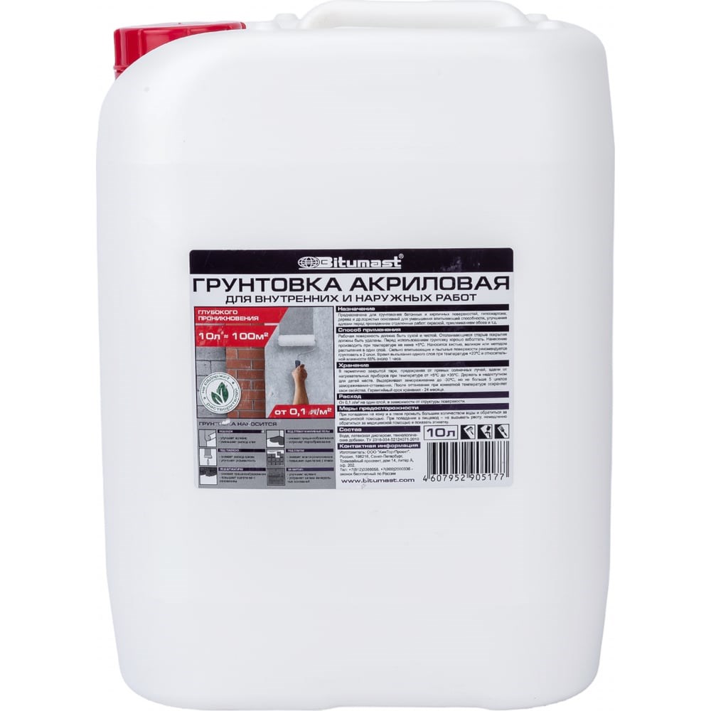 Акриловый грунт Bitumast готовый к применению 10 л 4607952905177 предназначен для предварительной обработки пористых оснований (бетон, кирпич, гипсокартон, дерево) внутри и снаружи помещений. Состав глубоко проникает в структуру, уменьшает впитывающую способность поверхности, улучшает адгезию и снижает расход финишных отделочных материалов (краска, клей, штукатурка, шпатлевка). Продукт используют перед приклеиванием обоев для предотвращения образования пор и трещин.