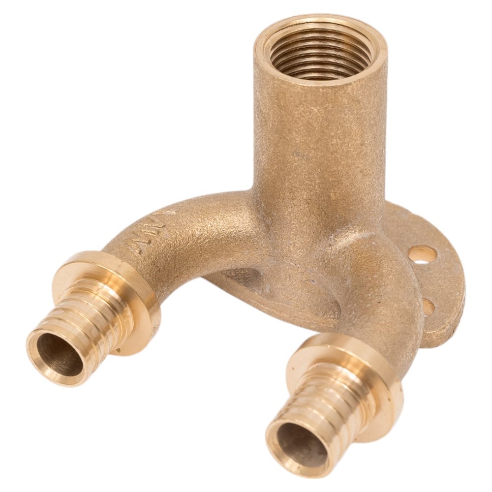 Аксиальное двойное настенное колено MVI с внутренней резьбой 16x1/2"х16, латунь SF635040404 предназначена для подключения сантехнических приборов в системе горячего водоснабжения с рециркуляцией. Колено имеет один вход, один выход и резьбовой выход 1/2" на потребителя (точки водоразбора). Для удобства крепления на стену, водорозетка имеет монтажную площадку с отверстиями для крепежа. Колено используется для создания соединения в системе аксиальнных фитингов для труб из сшитого полиэтилена. Фитинг не имеет резиновых уплотнений. Материал корпуса - латунь CW617N.