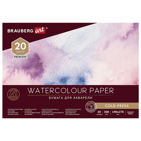 Альбом для акварели, бумага 300 г/м2, 190х270 мм, среднее зерно, 20 листов, склейка, BRAUBERG ART PREMIERE, 113222