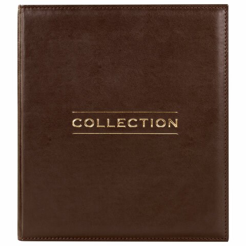 Альбом размером 245х270 мм выполнен из качественной экокожи и представлен в коричневом цвете. Укомплектован пятью листами-вкладышами для монет (листы для бон в комплект не входят): 2 листа с карманами размером 28х28 мм (48 шт.), 2 листа с карманами размером 35х35 мм (35 шт.) и 1 лист с карманами размером 44х40 мм (24 шт.). Итого альбом вмещает 190 монет диаметром до 38 мм. Материал листов – ПВХ.