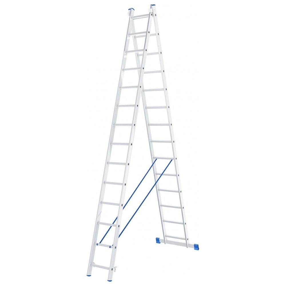 Алюминиевая двухсекционная лестница СИБРТЕХ 2х14 ступеней 97914 подходит для выполнения работ на высоте до 7.25 м. При изготовлении использовался прессованный алюминиевый профиль прямоугольного сечения. Это гарантирует изделию коррозионную стойкость и прочность. Защиту от скольжения на рабочих поверхностях обеспечивают заглушки и широкая траверса.