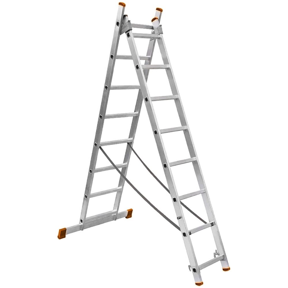 Алюминиевая двухсекционная лестница TDM ELECTRIC Народная ЛА2x7 высота 2880 мм SQ1028-0201 применяется при строительных и монтажных работах, на складских объектах, садовом участке. Изготовлена из алюминия, благодаря чему отличается прочностью, устойчивостью к образованию коррозии и небольшим весом. Дополнительные ремни фиксируют секции лестницы и предотвращают расхождение боковин, обеспечивая устойчивость стремянки при работе на любой высоте. Опоры оснащены наконечниками, которые защищают лестницу от произвольного скольжения, что гарантирует безопасность при работе.