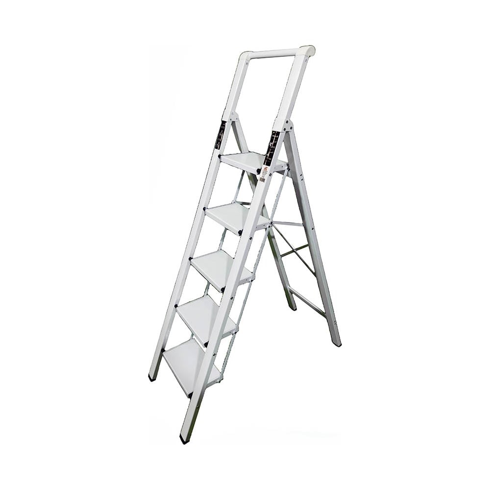 Стремянка алюминиевая SevenBerg Calipso 5 широких ступеней белаяСтремянка с широкой ступенью и поручнем безопасности, надежная и лёгкая, подойдёт для любых строительных работ, а так как имеют современный дизайн может украсить интерьер новой квартиры и станет помощником на долгое время.Изготовлена из алюминиевого сплава и окрашены белой эмалью.Алюминиевый профиль боковин размером 40х25 мм. толщиной 1 мм. имеет спереди полукруглую форму, которая придаёт стремянки изящный вид.Широкие алюминиевые ступени размером 29х18 см. имеют рифленую поверхность против скольжения позволяют работать на любой из них.Быстро складывается и благодаря малым размерам в сложенном виде (толщина всего 7 см., ширина 45 см.) не занимает много места при хранении.Высота шага ступени - 24 см.Габаритный размер в сложенном виде ДхШхВ: 179х45х7 см.Круглый поручень безопасности высотой 45 см. диаметром 32 мм. для комфортной работы на последней ступени.Максимальная нагрузка на ступень -150 кг.
