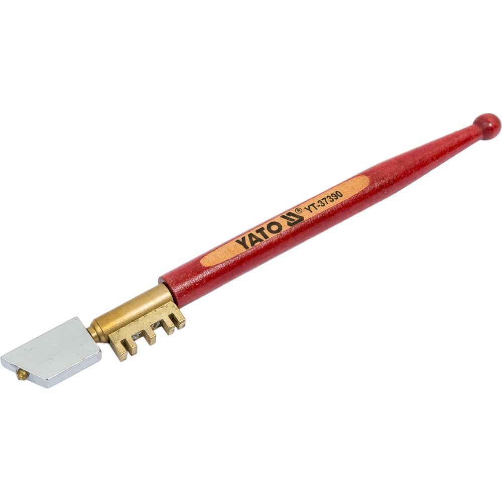Стеклорез с алмазным наконечником предназначен для резки стекла. Модель оснащена стальной головкой, срезанной под углом, и подвижно размещенной на валу. Над головой находится латунный элемент с вырезами для разбития стекла. Деревянная ручка удобна в работе. Общая длина ножа 175 мм.
