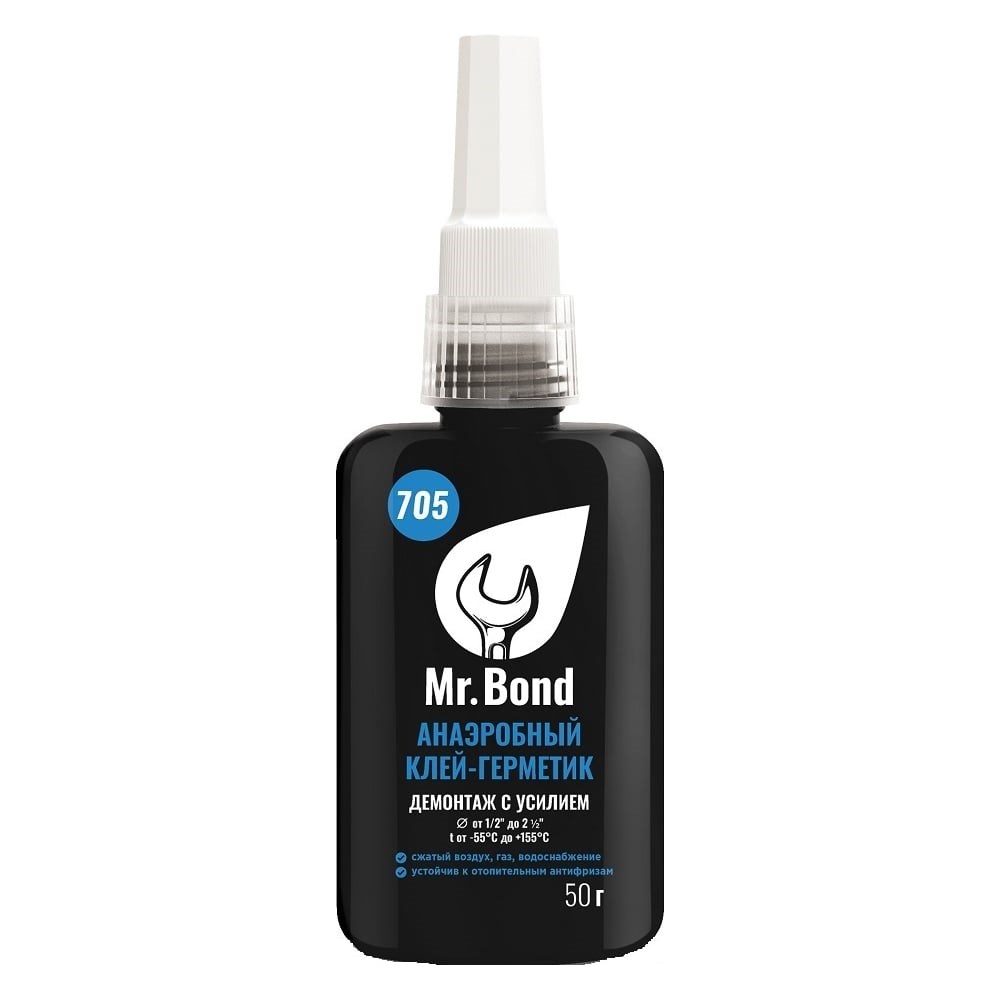Анаэробный герметик Mr.Bond 705 демонтаж с усилием, синий, 50 г MB4070500050 используют для надежной фиксации резьбовых соединений труб и фитингов во время монтажа систем водоснабжения, газоснабжения и отопления. Экологически чистый продукт подходит для металлических деталей (хром, цинк, латунь, сталь, гальваника, чугун) и большинства гидравлических систем. Состав быстро заполняет зазоры, полости и щели, вытесняя кислород. Клеевой шов выдерживает длительное воздействие воды, газа, сжатого воздуха и бензина.