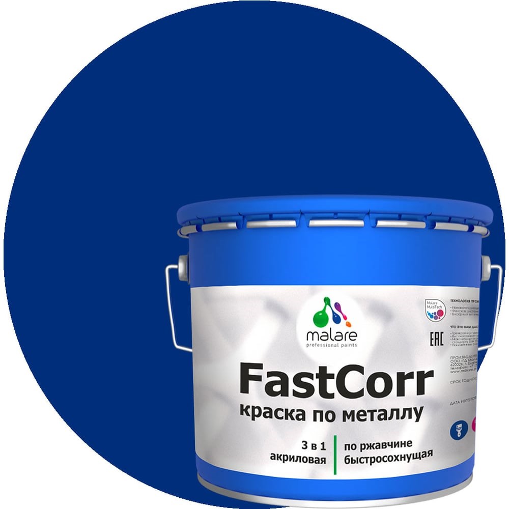 Краска по металлу Malare FastCorr представляет собой суспензию пигментов и наполнителей в растворе полиакриловой смолы с добавлением антикоррозийных пигментов и функциональных добавок. Совмещает в себе свойства преобразователя ржавчины, антикоррозийной грунтовки и финишного эмалевого покрытия. Предназначена для антикоррозионной защиты металлических поверхностей со следами коррозии (с толщиной коррозионного слоя не более 100 мкм). Является самостоятельным антикоррозийным покрытием для металлических поверхностей, подвергающихся атмосферным воздействиям и для окраски внутри помещений.