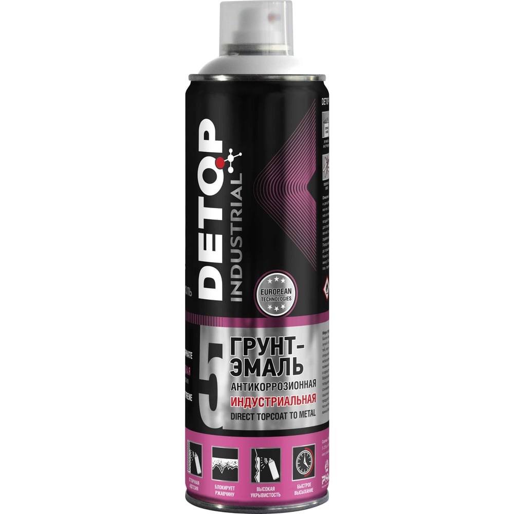 Грунт-эмаль DETOP антикоррозионная, сигнальный белый, RAL 9003, аэрозоль 650 мл DTI-A07734 выполняет функцию антикоррозионного грунта и декоративной эмали. Основа на гибридной смоле, фосфат цинка и светостойкие пигменты создают долговечное стойкое к атмосферным воздействиям защитно-декоративное антикоррозионное покрытие, обладающее высокой прочностью и устойчивостью к воздействию воды, минеральных масел и дизельного топлива. Грунт-эмаль применяется для покраски металлических конструкций промышленного назначения, сельскохозяйственной, коммунально-бытовой и дорожно-строительной техники, технологического оборудования, гаражей, кованых металлических изделий и строительных металлоконструкций. Внимание! Фото может отличаться от товара, при выборе ориентируйтесь на технические характеристики.