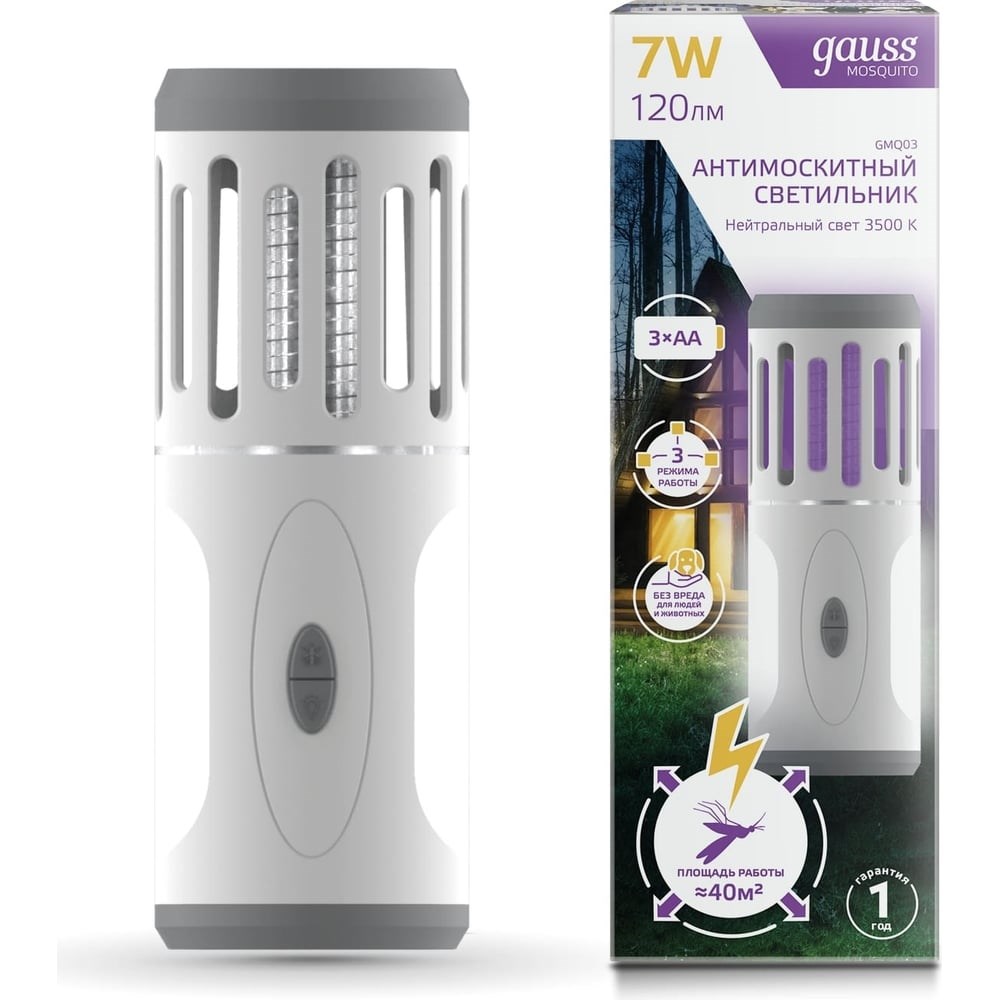 Антимоскитный светильник GAUSS Mosquito 7 Вт 3хAA GMQ03 – световое устройство, которое защищает от летающих насекомых как внутри помещения, так и снаружи, например, в беседке, террасе или туристической палатке.Имеет 3 режима работы: режим защиты от насекомых с ультрафиолетовым излучением, общий режим свечения с цветовой температурой 3500К, комбинированный режим с подсветкой и защитой от насекомых.Ультрафиолет притягивает комаров, мотыльков и других летающих насекомых, а за счет напряжения исходящего от светильника при соприкосновении со стенкой они погибают.Кисточка, предоставляемая в комплекте, позволяет быстро и легко очистить светильник от насекомых.