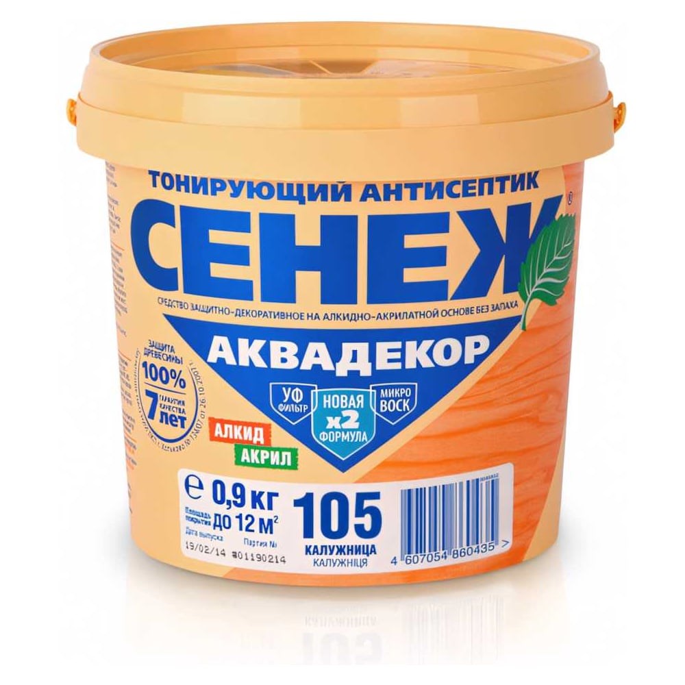 Антисептик для дерева СЕНЕЖ АКВАДЕКОР Х2-105 калужница, 0.9 кг 11046 предназначен для долговременной защиты древесины от атмосферных осадков, плесневых, деревоокрашивающих и дереворазрушающих грибов, водорослей и насекомых-древоточцев, а также декоративной отделки под ценные породы. Готовый к применению водоразбавляемый состав на алкидно-акрилатной основе с добавлением льняного масла отлично проникает в древесину, формирует эластичное дышащее защитное покрытие с мягким шелковистым блеском. Материал используют для наружных и внутренних работ (окрашивание стен, обшивок, перегородок, фронтонов, дверей, оград, садовой мебели, фанеры, шпона, ДСП и ДВП, а также других пиленых, строганных, рубленых деревянных поверхностей). Допускается обработка антисептиком полов, перил, террас с последующим покрытием устойчивым к истиранию лаком. Способ применения: Продукт перед использованием тщательно перемешать и наносить на очищенную от грязи, пыли, старых покрытий древесину кистью, валиком, губкой, безвоздушным распылением в 1-2 слоя (внутренние работы) или 2-3 слоя (наружные работы, влажные или солнечные условия) вдоль волокон с промежуточной сушкой 45-60 минут в сухую облачную погоду при температуре воздуха не ниже +5 градусов. Особо тщательно обрабатывать торцы. Не обрабатывать мерзлую древесину. Время высыхания 1 час (от пыли). Расход для однослойного нанесения для пиленой поверхности 120 - 180 г/кв. м, для строганной поверхности 70 - 90 г/кв. м. Внимание! Окончательный цвет формируется при высыхании.