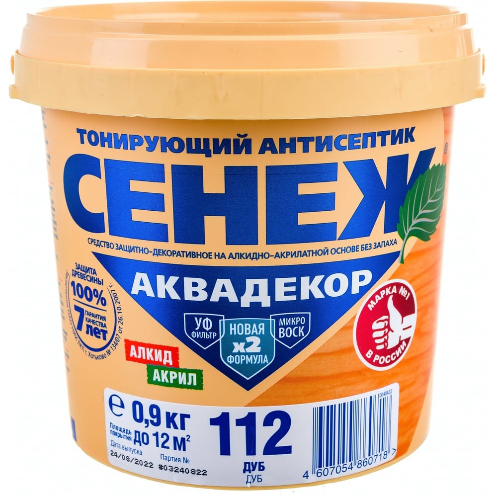 Антисептик для дерева СЕНЕЖ АКВАДЕКОР Х2-112 дуб, 0.9 кг 11066 предназначен для долговременной защиты древесины от атмосферных осадков, плесневых, деревоокрашивающих и дереворазрушающих грибов, водорослей и насекомых-древоточцев, а также декоративной отделки под ценные породы. Готовый к применению водоразбавляемый состав на алкидно-акрилатной основе с добавлением льняного масла отлично проникает в древесину, формирует эластичное дышащее защитное покрытие с мягким шелковистым блеском. Материал используют для наружных и внутренних работ (окрашивание стен, обшивок, перегородок, фронтонов, дверей, оград, садовой мебели, фанеры, шпона, ДСП и ДВП, а также других пиленых, строганных, рубленых деревянных поверхностей). Допускается обработка антисептиком полов, перил, террас с последующим покрытием устойчивым к истиранию лаком. Способ применения: Продукт перед использованием тщательно перемешать и наносить на очищенную от грязи, пыли, старых покрытий древесину кистью, валиком, губкой, безвоздушным распылением в 1-2 слоя (внутренние работы) или 2-3 слоя (наружные работы, влажные или солнечные условия) вдоль волокон с промежуточной сушкой 45-60 минут в сухую облачную погоду при температуре воздуха не ниже +5 градусов. Особо тщательно обрабатывать торцы. Не обрабатывать мерзлую древесину. Время высыхания 1 час (от пыли). Расход для однослойного нанесения для пиленой поверхности 120 - 180 г/кв. м, для строганной поверхности 70 - 90 г/кв. м. Внимание! Окончательный цвет формируется при высыхании.