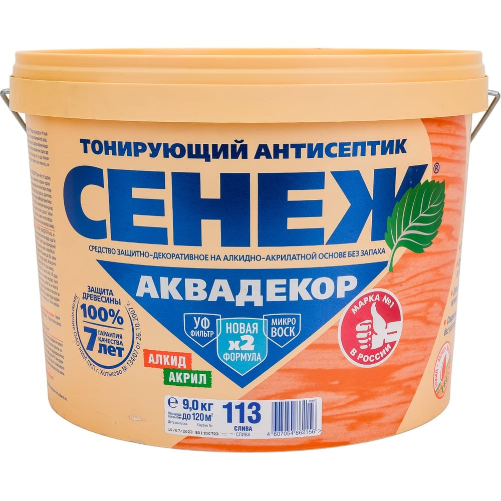 Антисептик для дерева СЕНЕЖ АКВАДЕКОР Х2-113 слива, 9 кг 11071 предназначен для долговременной защиты древесины от атмосферных осадков, плесневых, деревоокрашивающих и дереворазрушающих грибов, водорослей и насекомых-древоточцев, а также декоративной отделки под ценные породы. Готовый к применению водоразбавляемый состав на алкидно-акрилатной основе с добавлением льняного масла отлично проникает в древесину, формирует эластичное дышащее защитное покрытие с мягким шелковистым блеском. Материал используют для наружных и внутренних работ (окрашивание стен, обшивок, перегородок, фронтонов, дверей, оград, садовой мебели, фанеры, шпона, ДСП и ДВП, а также других пиленых, строганных, рубленых деревянных поверхностей). Допускается обработка антисептиком полов, перил, террас с последующим покрытием устойчивым к истиранию лаком. Способ применения: Продукт перед использованием тщательно перемешать и наносить на очищенную от грязи, пыли, старых покрытий древесину кистью, валиком, губкой, безвоздушным распылением в 1-2 слоя (внутренние работы) или 2-3 слоя (наружные работы, влажные или солнечные условия) вдоль волокон с промежуточной сушкой 45-60 минут в сухую облачную погоду при температуре воздуха не ниже +5 градусов. Особо тщательно обрабатывать торцы. Не обрабатывать мерзлую древесину. Время высыхания 1 час (от пыли). Расход для однослойного нанесения для пиленой поверхности 120 - 180 г/кв. м, для строганной поверхности 70 - 90 г/кв. м. Внимание! Окончательный цвет формируется при высыхании.