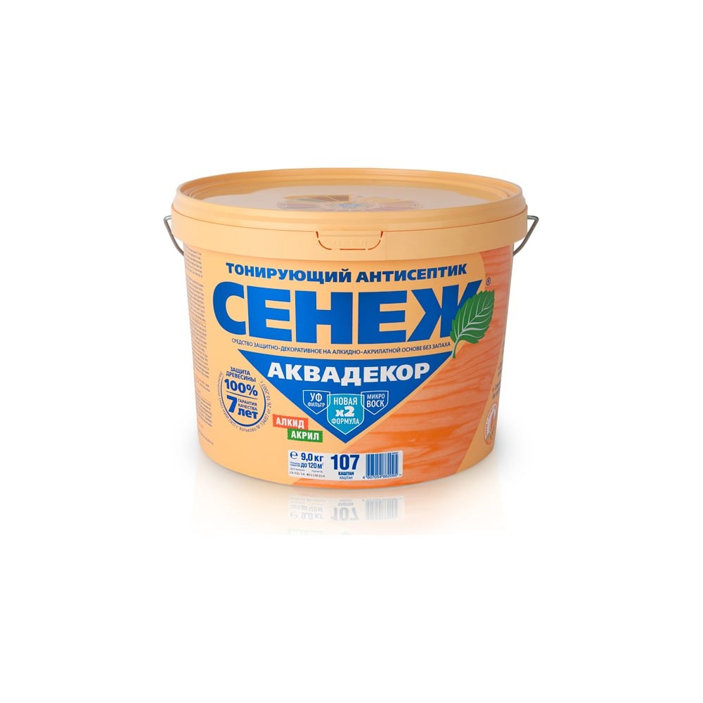 Антисептик для дерева СЕНЕЖ АКВАДЕКОР Х2-107 каштан, 9 кг 11054 предназначен для долговременной защиты древесины от атмосферных осадков, плесневых, деревоокрашивающих и дереворазрушающих грибов, водорослей и насекомых-древоточцев, а также декоративной отделки под ценные породы. Готовый к применению водоразбавляемый состав на алкидно-акрилатной основе с добавлением льняного масла отлично проникает в древесину, формирует эластичное дышащее защитное покрытие с мягким шелковистым блеском. Материал используют для наружных и внутренних работ (окрашивание стен, обшивок, перегородок, фронтонов, дверей, оград, садовой мебели, фанеры, шпона, ДСП и ДВП, а также других пиленых, строганных, рубленых деревянных поверхностей). Допускается обработка антисептиком полов, перил, террас с последующим покрытием устойчивым к истиранию лаком. Способ применения: Продукт перед использованием тщательно перемешать и наносить на очищенную от грязи, пыли, старых покрытий древесину кистью, валиком, губкой, безвоздушным распылением в 1-2 слоя (внутренние работы) или 2-3 слоя (наружные работы, влажные или солнечные условия) вдоль волокон с промежуточной сушкой 45-60 минут в сухую облачную погоду при температуре воздуха не ниже +5 градусов. Особо тщательно обрабатывать торцы. Не обрабатывать мерзлую древесину. Время высыхания 1 час (от пыли). Расход для однослойного нанесения для пиленой поверхности 120 - 180 г/кв. м, для строганной поверхности 70 - 90 г/кв. м. Внимание! Окончательный цвет формируется при высыхании.