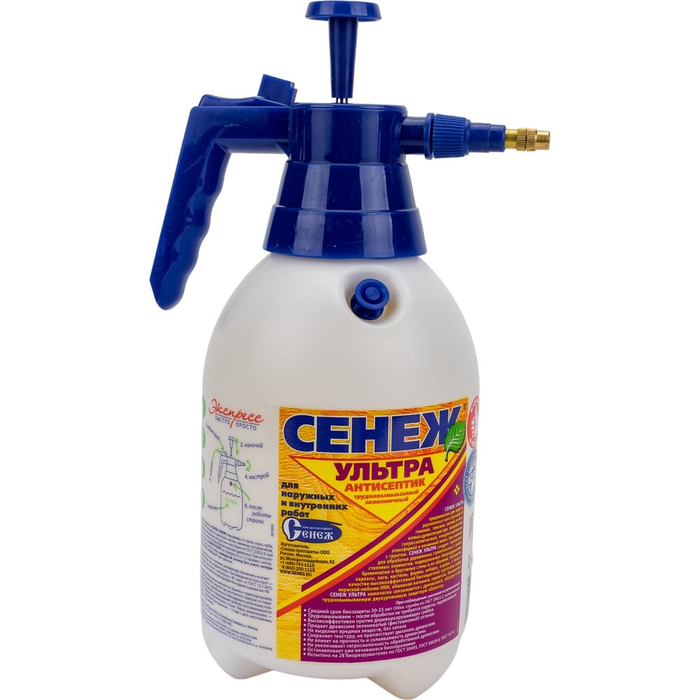 Антисептик для дерева СЕНЕЖ УЛЬТРА экспресс помпа, 2 кг 00000006150 предназначен для защиты древесины от гниения, плесени, синевы и насекомых-древоточцев внутри помещений и на открытом воздухе при непосредственном воздействии атмосферных осадков, почвенной влаги, гигроскопическом и конденсационном увлажнении, контакте с грунтом самостоятельно или в качестве биозащитной грунтовки под ЛКМ. Область применения: Продукт используют для новых и ранее обработанных антисептиком деревянных обрешеток и каркасов, лаг, ферм, стен и их обшивок, настилов, заборов, оград, других пиленых, строганных, рубленых элементов конструкций жилищного, общественного, производственного и сельскохозяйственного назначения. Внимание! Не применяют по поверхностям, ранее покрытым олифой, краской, лаком, другими пленкообразующими или водоотталкивающими материалами. Расход: При нанесении кистью, валиком, распылителем не менее 250 - 300 г/кв. м. При вымачивании или автоклавировании 60 - 80 кг/куб. м. Расход зависит от условий эксплуатации и требуемого срока службы обработанной древесины.