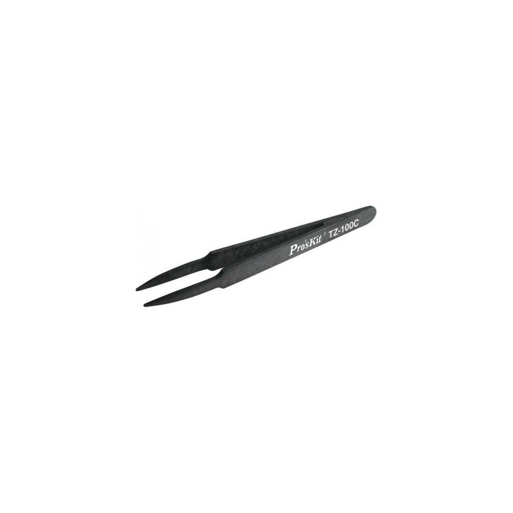 Антистатический пинцет ProsKit TZ-100C 00288495 подойдет для работ с мелкими предметами. Изделие выполнено из прочного углеродного волокна. Закругленные губки исключают повреждение компонентов при поднятии или выполнении других операций.