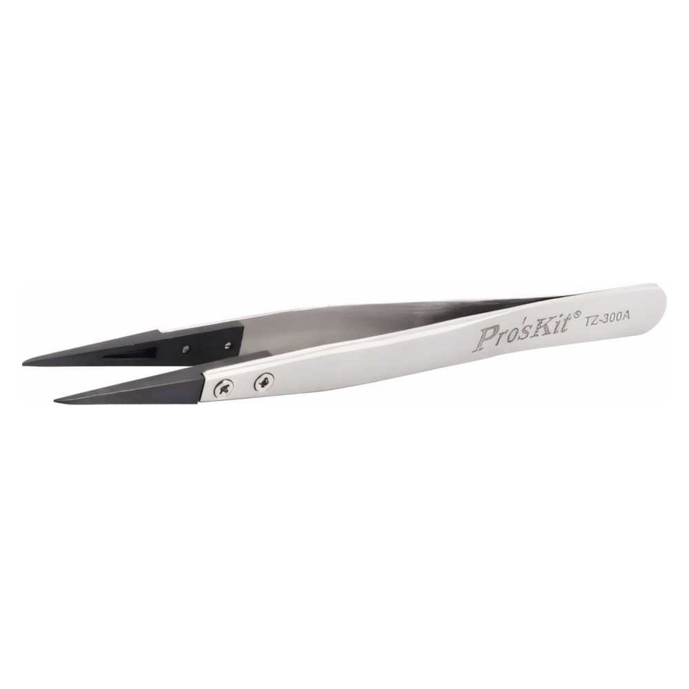 Антистатический пинцет ProsKit TZ-300A 00245528 оснащается накладками из смолы PPS-hb. Длина накладок - 27 мм. Инструмент устойчив к коррозии и кислотам. Антистатические свойства существенно упрощают работу с электроникой. Изделие не намагничено.