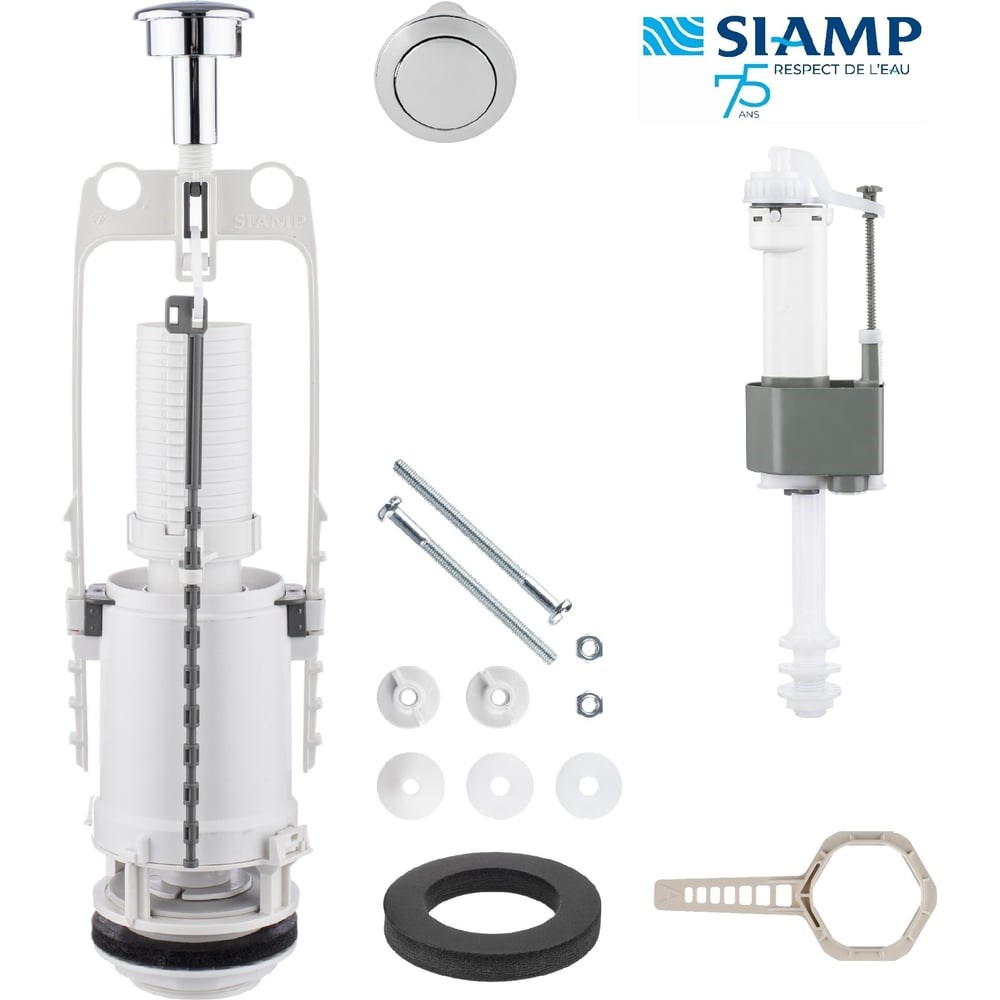 Клапан спускнойSTORM 33 с одинарным кнопочным пускомПодходит для бачков различной высоты: высота спускного клапана регулируется от 321 до 415мм.Предназначен для бачков с диаметром отверстия в крышке от 37 до 42мм. (допустимое смещение кнопки +/- 12 мм) и с отверстием в дне бачка диаметром от 58 до 72мм.Высокопрочная хромированная кнопка устойчивая к истиранию (покрытие нанесено методом гальванизации).Испытан и сертифицирован более чем на 200 000 циклов.Седло (или донный клапан) изготовлено из прочного пластика ABS.Прокладка между спускным клапаном и дном бачка выполнена из литого эластомера СБС. Её эластичность и форма усиливают герметичность донной части бачка.Прокладка между бачком и унитазом изготовлена из пенорезины, позволяет компенсировать неровности полки унитаза.Клапан наполнительный BRIO 755 ½’Наполнительный клапан с нижним подключением ½’, пластиковый штуцерУниверсальный, подходит для всех типов бачковГидравлическое закрытие (без гидравлического удара)Регулируемый уровень набора водыПропускная способность 0,14 л/с под давлением 3 барРабочее давление от 0,5 до 12 бар.Бесшумный NF (класс шума 1)Продукция изготовлена в соответствии с ГОСТ 21485-2016.Монтажный комплект в наборе поставки.