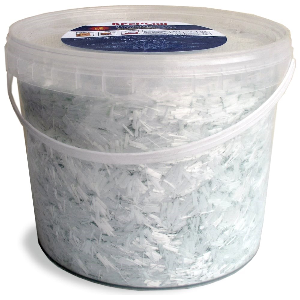 Армирующая фибра Крепыш 2,5 кг Arm-2,5 для строительных смесей и растворов - щёлочестойкая фибра из штапельного (рубленного) стекловолокна. Применяется в качестве укрепляющей армирующей добавки к различным строительным смесям (штукатурки, цемент, бетон), кладочным растворам, полусухим и мокрым стяжкам, стяжкам при устройстве тёплых полов и пр., для повышения их прочности, увеличения срока службы и защиты от трещин. Свойства: щёлочестойкая; в 2 раза повышает прочность и стойкость материала к линейным деформациям; сдерживает появление трещин; подходит для работ с применением растворонасосов и штукатурных машин; длина отрезков волокна – 12±2 мм; расход (на 100 г фибры «Крепыш») – до 0,2 м3 бетона или до 50 кг сухой строительной смеси срок годности – не ограничен. Способ применения: Предварительно развести в небольшом объёме холодной воды требуемое количество армирующей фибры «Крепыш» согласно таблице расхода, размещённой на товарной этикетке, и перемешать для того, чтобы пучки волокон разделились на отдельные волокна (эффект «набухания»). Полученную смесь добавить в готовый раствор строительной смеси, бетона и пр. и тщательно перемешать для равномерного распределения волокон по всему объёму раствора.