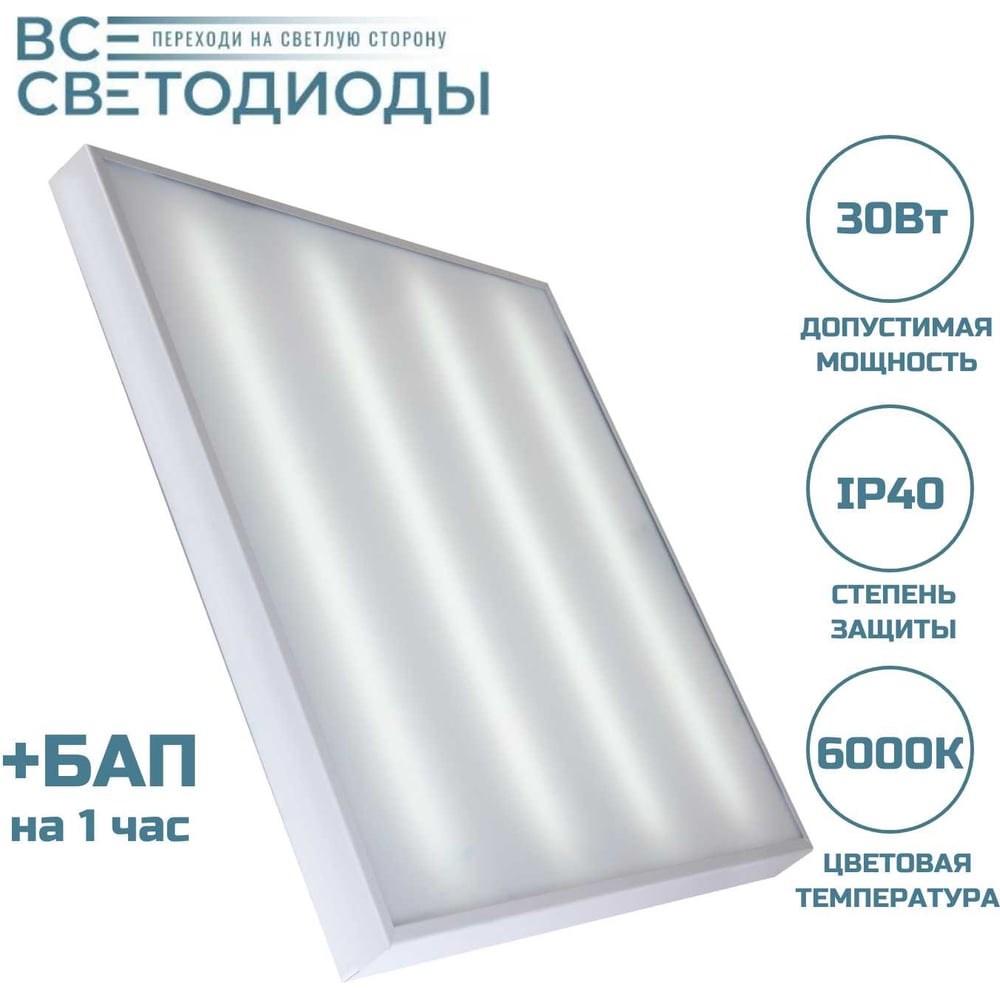 Аварийный потолочный светодиодный светильник ВСЕСВЕТОДИОДЫ Армстронг 30 Вт, 3600Lm, 6000К, IP40, Опал, БАП на 1 час