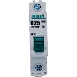 Автоматический выключатель серии ВА-101 Dekraft1Pноминальный ток 25 Ахарактеристика Сотключающая способность 4,5 кА5 монолитных заклепок повышают прочность корпуса аппарата. Сплошная лицевая панель обеспечивает безопасность эксплуатации аппарата. Боковые каналы охлаждения повышают стабильность работы при высоких температурах окружающей среды. Есть возможность установки дополнительных аксессуаров с левой стороны устройства. Аппарат на 100% совместим с корпусами Dekraft и Systeme Electric.
